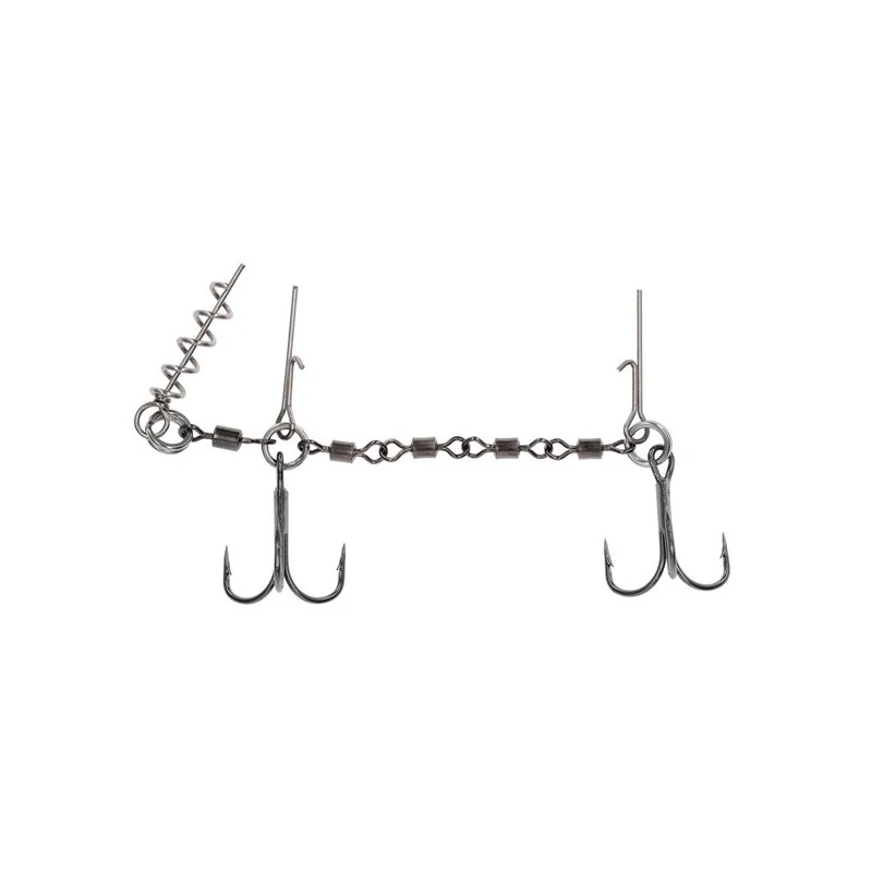 Dozbrojka na krętlikach Jaws Double Evo Stinger to podwójna dozbrojka z wkrętem i pinami. Zastosowanie kilku krętlików pozwoliło uzyskać bardzo mocne połączenie, które eliminuje możliwość wytworzenia zjawiska dźwigni podczas holu, dodatkowo stabilizując gumę. Rozmiar XL dedykowany do największych przynęt
