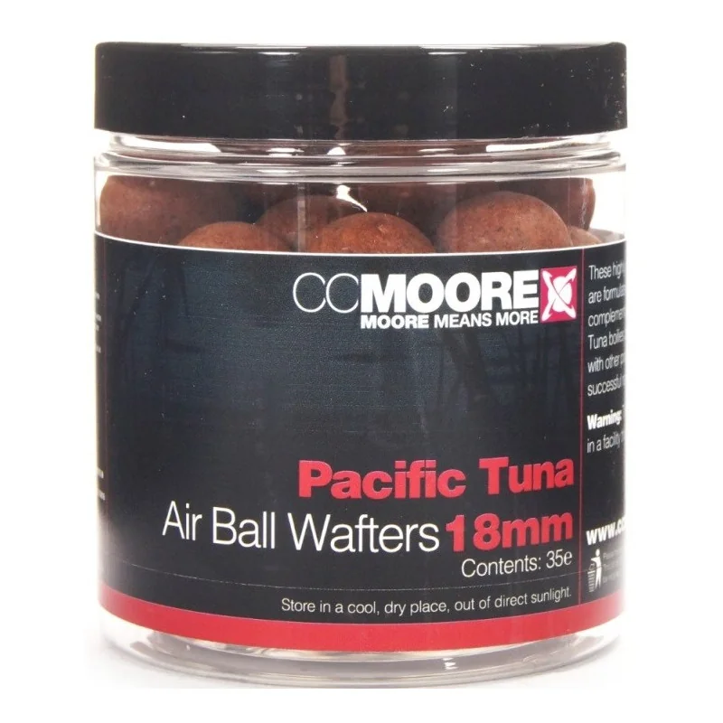 Air Ball Wafters Pacific Tuna to kulki o neutralnej pływalności CC Moore. Posiadają neutralną pływalność za sprawą dodatku mączki korkowej, dobre na przełowione łowiska. Zbudowane z tego samego mixu co kulki zanętowe Pacific Tuna. Zawierają Robin Red, tuńczyka, skorupiaki oraz ekstrakty roślinne - wyrazisty i wysoce atrakcyjny pikantny smak.