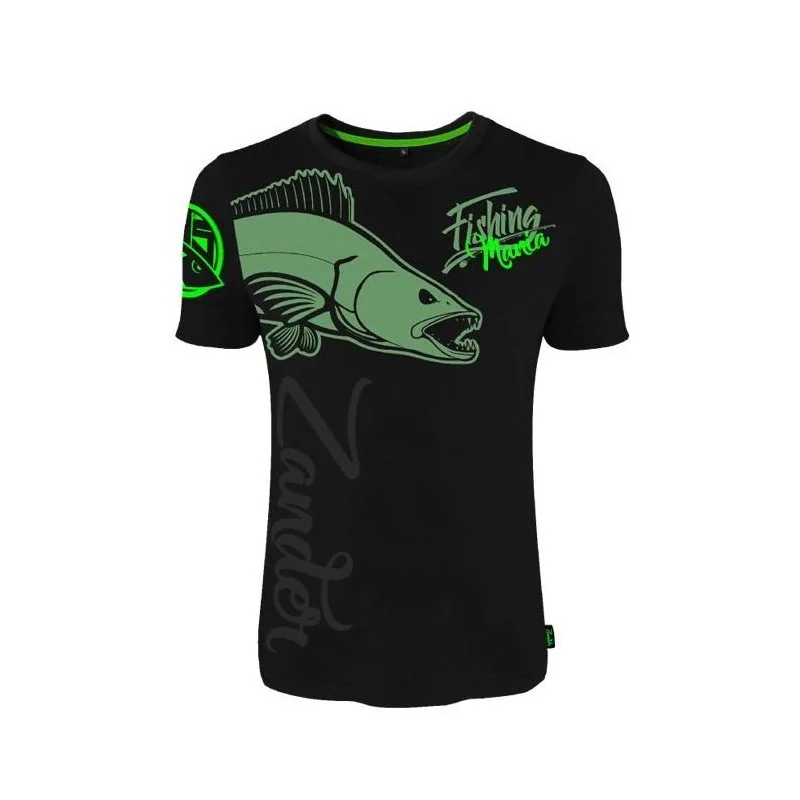 T-shirt Zander Mania to koszulka bawełniana z krótkim rękawem. Wykonana ze 100% bawełny o oddychających właściwościach w klasycznym stylu. Model z okrągłym prążkowanym kołnierzykiem, o regularnym kroju. Odpowiednia do wyjścia na ryby jak i codziennego noszenia. Opaska wchłaniająca pot na kołnierzyku, w tym samym stylu jak druk na przodzie, tworzy ciekawe wykończenie. Koszulkę Fishing Mania zdobi duży wydruk graficzny na klatce piersiowej z ulubiona ryba użytkownika.
