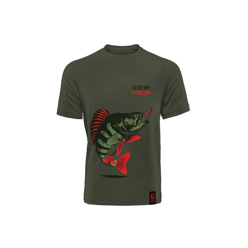 Koszulka Catch me! to oferta nowoczesnych koszulek z wizerunkiem ryby. Model dla wędkarzy zarówno na łowisko jak i do codziennych stylizacji. CATCH ME IF YOU CAN to świetny design dla profesjonalisty. Koszulka Catch me! Okoń zaprojektowana jest w ciemnozielonym kolorze z obliczem okonia właśnie podpływającego do przynęty, czyli momentu, na który czekają wszyscy miłośnicy łowienia tych ryb.