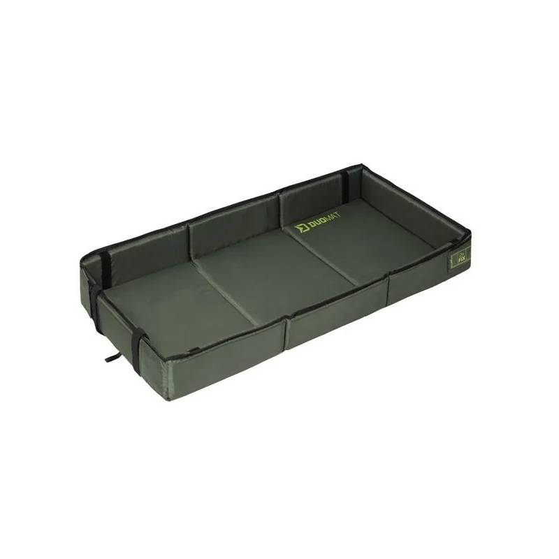 DOUMAT oznacza również, że tę matę do odhaczania można używać jako matę standardową bez podniesionych krawędzi, lub możemy po prostu podnieść te krawędzie i przymocować je za pomocą zapięć na rzepy znajdujących się w każdym rogu. Tworzy to bezpieczniejszą matę z podniesionymi krawędziami. Może to zapobiec wydostawaniu się ryby i być może jej zranieniu. Mata jest również wyposażona w dwie metalowe szpilki i wszyte oczka, które służą do przymocowania do podłoża podczas wietrznej pogody. Na te szpilki zaprojektowano małą kieszeń, dzięki czemu są zawsze pod ręką. Mata wykonana jest z szybko schnącego materiału, który jest łatwy do czyszczenia. Dzięki przemyślanej konstrukcji i wysokiej jakości detali, mata do odhaczania DUOMAT otrzymała nagrodę Grand Prix na targach For Fishing 2020 w kategorii: najciekawszy produkt targów. DUOMAT to wysokiej jakości i bardzo kompaktowa opcja maty kołyskowej, która jest znacznie łatwiejsza do przenoszenia.