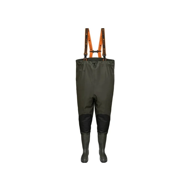 Spodniobuty - Premium to nowy projekt Mikado odzieży ochronnej na wędkarskie wyprawy. Solidny poliestrowy materiał z włóknem podwyższonej trwałości o właściwościach wodoodpornych i wiatroszczelnych. Model wysoki w wersji z szelkami zaopatrzony w kieszeń na dokumenty i wzmocnienia na kolanach. Kalosze z bieżnikiem na podeszwie dla lepszej przyczepności na trudnym terenie. Spodniobuty-Premium MIKADO to produkt MUST HAVE 2023!