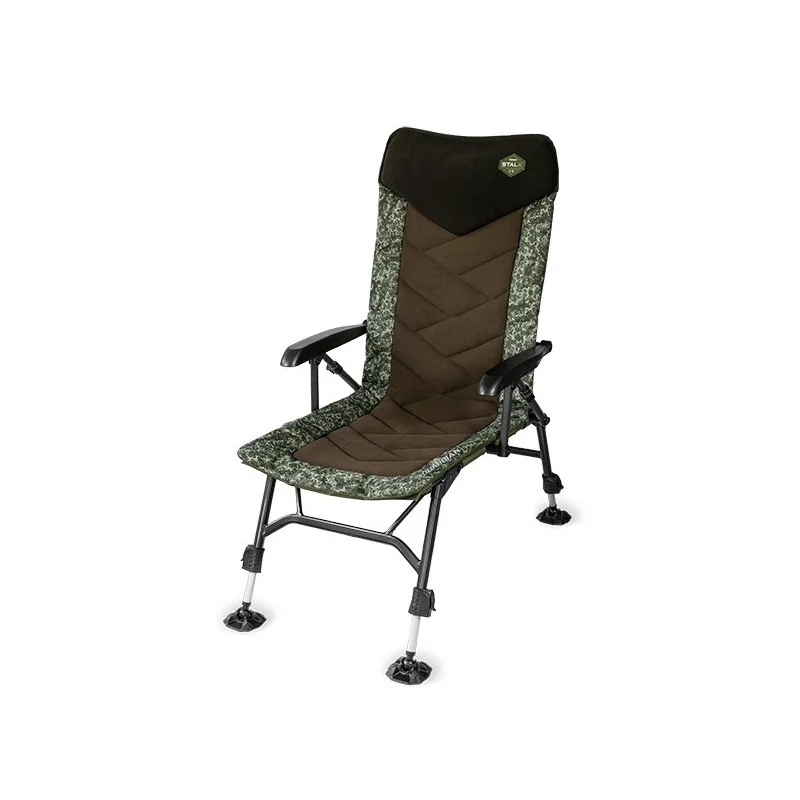 Ekskluzywne krzesło z wyższym oparciem oferuje największy komfort podczas wypraw wędkarskich. Ma lekką, ale wytrzymałą zieloną konstrukcję i stylowe wyściełanie, które od razu przyciąga wzrok. Wyściełanie składa się z kilku tkanin, z polarowym panelem na środku wykończonym wyrazistym szwem. Na brzegach znajduje się tkanina 600D z kamuflażem C2G. Zagłówek ma dodatkową zieloną wyściółkę z polaru dla jeszcze lepszego komfortu, aby utrzymać ciepło szyi.