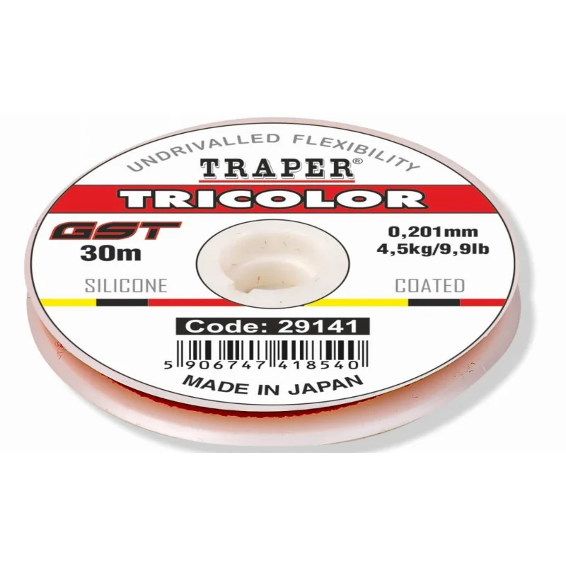 Żyłka GST Tricolor to japońska , zawodnicza żyłka o bardzo wysokich parametrach. Charakteryzuje się niezwykłą miękkością i rozciągliwością, zapewnia to bezpieczny, uwieńczony sukcesem hol. Bardzo wyraźne, odcięte przejścia między dwoma kolorami fluo - żółtym i różowym znajduje się 15 centymetrowy odcinek w kolorze czarnym. Sprawia to, że żyłka jest doskonale widoczna bez względu na naświetlenie i pogodę. Doskonała do metody żyłkowej.