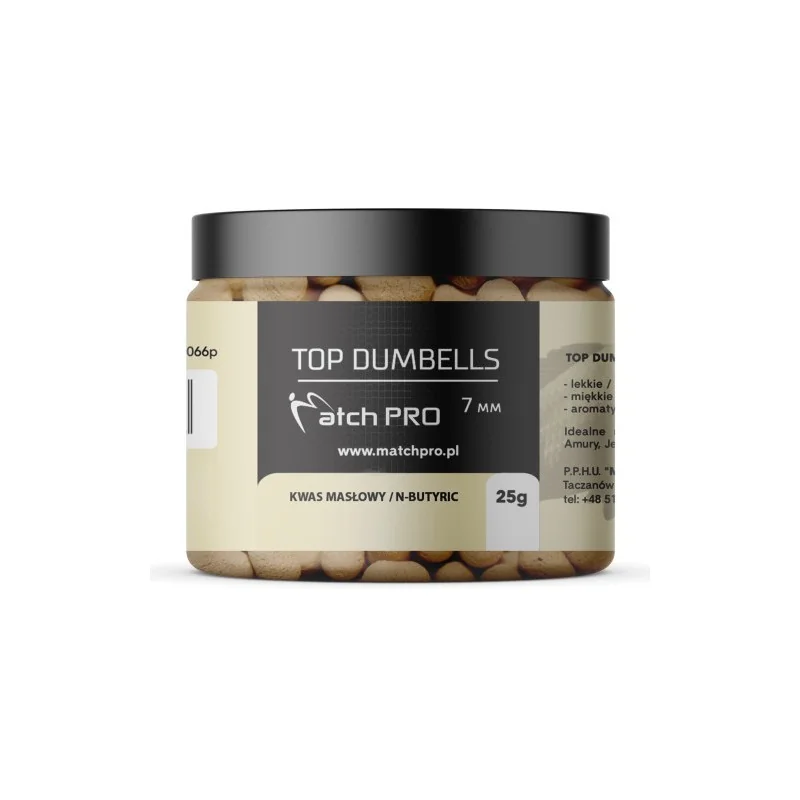 Przynęta Top Dumbells Sinking to seria najwyższej jakości przynęt o kształcie wałka (dumbells) w rozmiarze 7mm. Długie i intensywne testy tych przynęt pozwoliły dopracować ich skład i właściwości tak aby były bardzo skuteczne w każdych warunkach. To co wyróżnia Matchpro Top Dumbells to idealna miękkość, dzięki której ryby pewnie ją pobierają. Wyjątkowa lekkość przynęty zapewnia bardzo naturalne zachowanie się w wodzie co niezwykle podnosi skuteczność łowienia. Top Matchpro Dumbells są bardzo aromatyczne, oddając przez długi czas równomiernie aromat w wodzie co przekłada się na dużą ilość brań. Różnorodność smaków i kolorów pozwala dopasować się każdemu wędkarzowi do aktualnych warunków panujących na łowisku.
