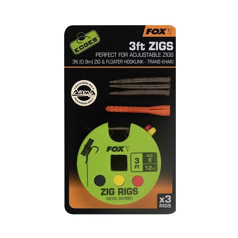 EDGES™ ZIG RIGS doskonale zawiązany Zig Rig świetny do łowienia wysoko w toni. Długość przyponu 12ft (370cm) odpowiednia do łowienia z wykorzystaniem klipsa Zig Rig Lead Clip (można ją przycinać). Długość przyponu 3ft (90cm) odpowiednia do stosowania z pływakiem Zig Float.