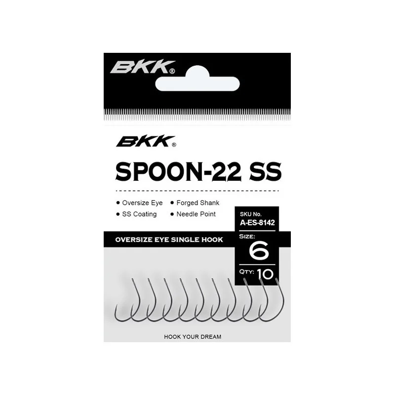 Haki Spoon-22 SS do łowienia dużych pstrągów i łososi zarówno w wodach słodkich, jak i słonych. Haczyk ma powiększone oczko dla lepszej mobilności, wygięty do wewnątrz grot, który zapobiega zahaczaniu, oraz super gładką powłokę BKK SS zapewniającą natychmiastową penetrację. Zaprojektowany z myślą o łowieniu troci.