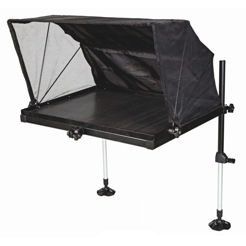 Platforma GST z osłoną doskonale chroni przynęty przed nadmiernym słońcem i deszczem. Osłona posiada regulację na pokrętła. Występują dwa modele z otworami na kuwety oraz z ażurowym blatem. Boki osłony wykonane są z siatki cyrkulacyjnej.