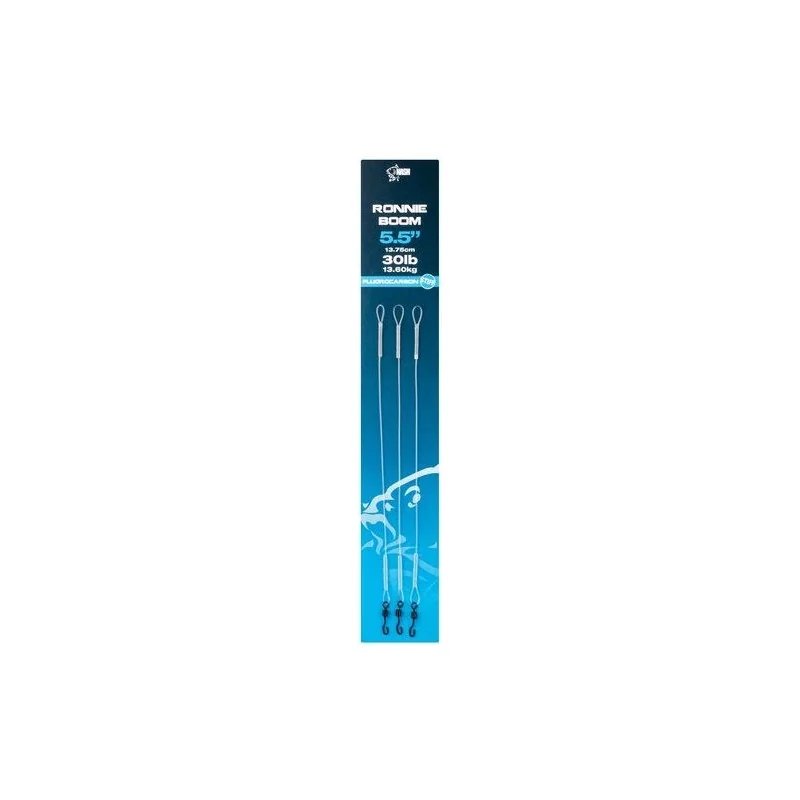 Roonie Boom to odporny na skręcanie, ekstremalnie wytrzymały odcinek gotowego Fluorocarbonu zapewniający perfekcyjną prezentację przyponu Ronnie Rig, odrzuca przynętę od zestawu końcowego w celu zapewnienia optymalnego zassania przynęty na każdym rodzaju dna. Krętlik Ronnie Swivel umożliwia szybką wymianę haczyków za pomocą Tungsten Kickers bez konieczności użycia węzłów czy rurki termokurczliwej.