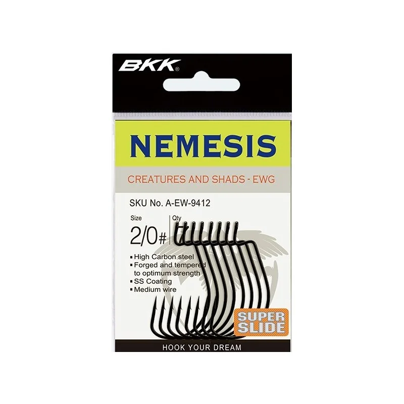 Haczyki offsetowe Nemesis do zbrojenia dużych miękkich przynęt. BKK Nemesis posiadają bardzo szerokie oczko. Ułożenie haka pozwala na pewne i szybkie zacięcie ryby podczas brania.