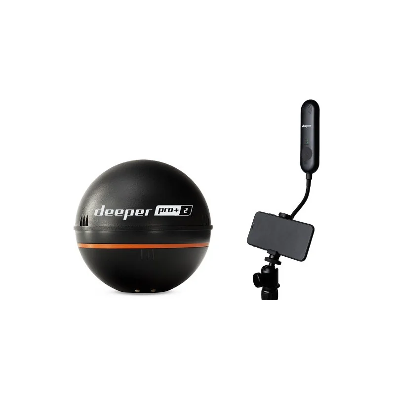 Zestaw PRO + 2 z Range Extender Kit to pakiet promocyjny echosonda PRO + 2 i wzmacniacz sygnału Wi-Fi Deeper Range Extender z uchwytem na telefon, który pasuje do większości telefonów.