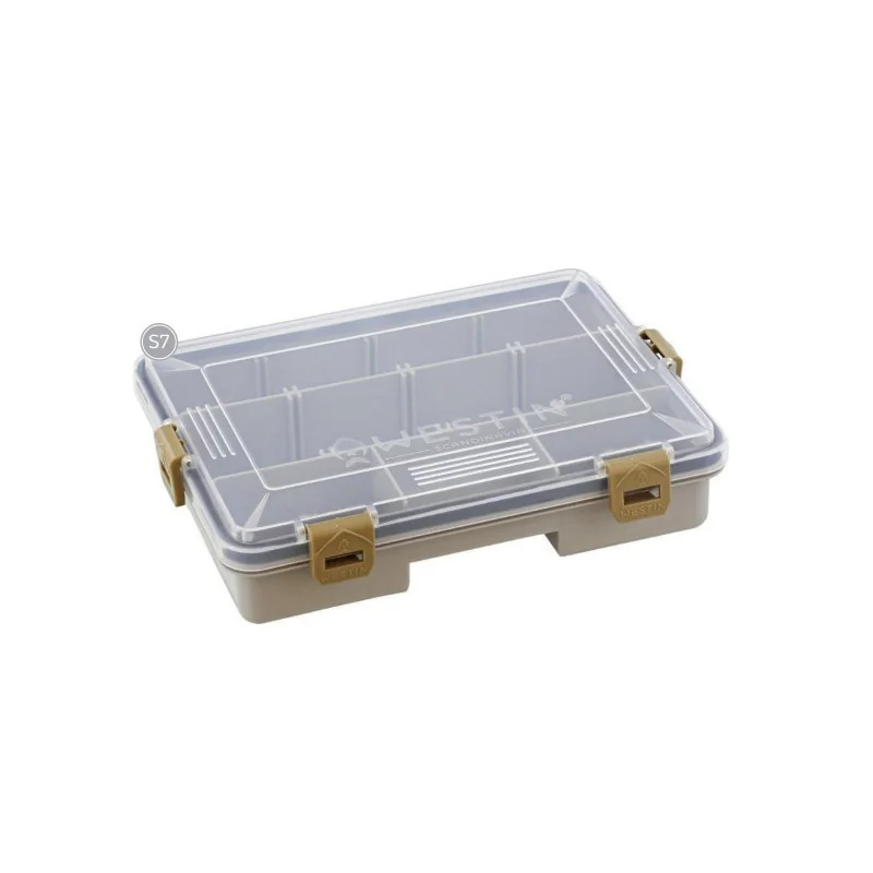 Westin’s W3 waterproof tackle box is the answer for dry storage ofyour fishing supplies on the boat or near water. The tackle box featuresa water-resistant rubber seal on the inside of the hinged lid, which keepswater out. Flavoured lures in liquid can also be stored in this box withoutleakage into your boat, bag, or car. This box is an S7 model with threefixed compartments in the front third and two fixed full length compartments with six dividers.