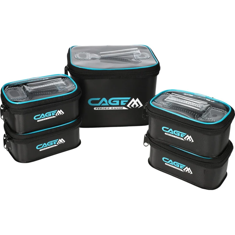 Pojemnik EVA - CAGE ACC BOX SYSTEM - ZESTAW 002 to komplet kuferków z wodoodpornych materiałów EVA, w którego skład wchodzi jedna duża torba i cztery małe pojemniki na drobne akcesoria, czy koszyczki zanętowe. Wszystkie kuferki wyposażone są w przezroczystą pokrywę na suwak i rączkę transportową.