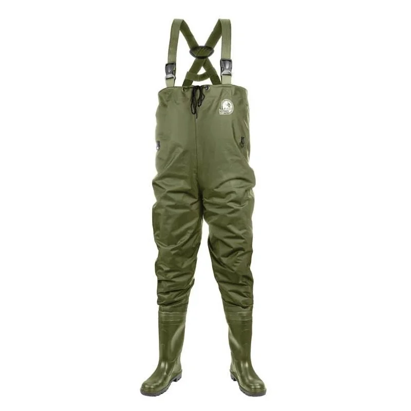 Kalosze w spodniobutach wykonane są z PVC i wyposażono je w antypoślizgową podeszwę z wyraźnie zaznaczonym bieżnikiem, co zwiększa bezpieczeństwo i komfort podczas przemieszczania się w mokrym i śliskim otoczeniu.