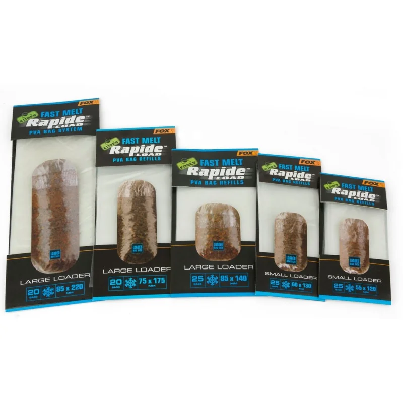 Woreczki Rapide Load PVA Bag - Fast Melt Refills to szybko rozpuszczalne woreczki rozpuszczalne PVA. Można ich używać zarówno samodzielnie jak i w systemie FOX Rapid Load PVA Bag System Kit - jest to bardzo pomysłowy system do robienia pakietów z woreczków PVA. Zestaw wystarczy kupić raz - później dokupuje się tylko woreczki PVA.