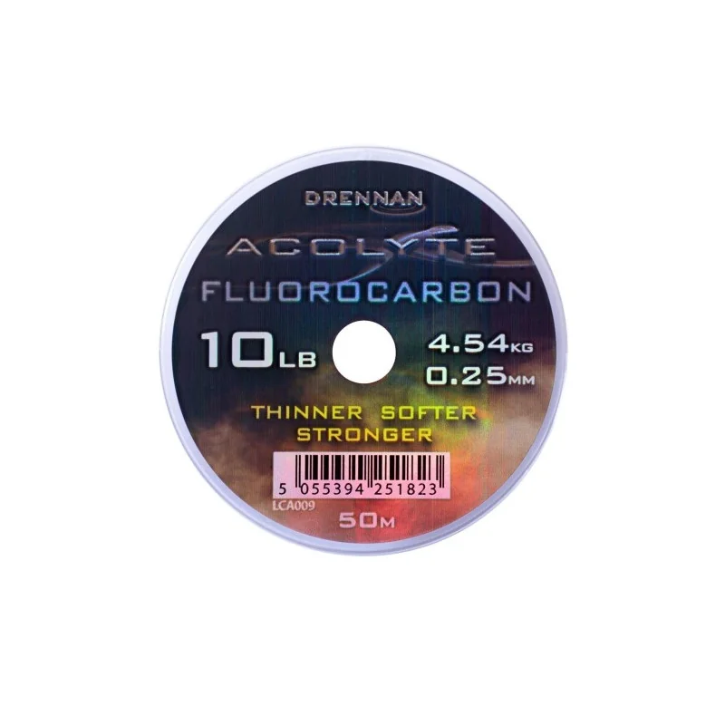 Fluorocarbon Acolyte wykonany jest z nowego materiału hi-tech, który jest cieńszy, miększy i mocniejszy od innych fluorocarbonów. Będąc w 100% czystym fluorocarbonem świetnie zachowuje się w wodzie i jest niewidoczny, posiada bowiem współczynnik załamania światła zbliżony do wody czyniąc go najlepszym materiałem przyponowym.