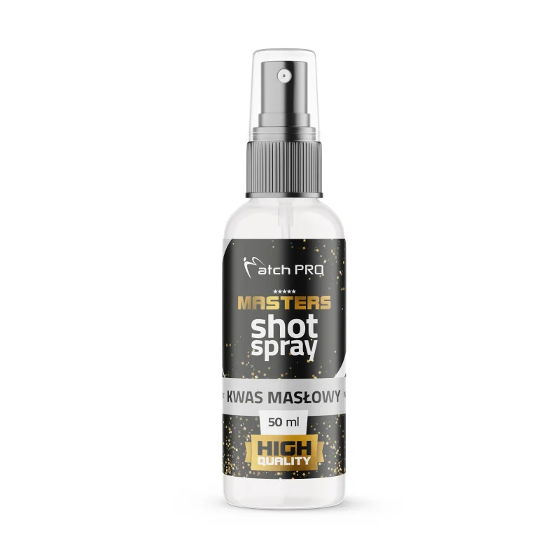Najwyższej jakości zawodnicza seria atraktorów w sprayu. Bardzo mocno skondensowany naturalny aromat w 27 odmianach pozwala dopasować się do każdego łowiska i preferencji ryb w danym dniu. Masters Shot dedykowany jest do dopalenia koszyka zanętowego, kulek, zanęty, pelletu, przynęt oraz ziaren. Po użyciu tworzy powłokę aromatyczną, która utrzymuje się przez długi czas – wabiąc ryby. Masters Shot jest bardzo skuteczny, gdy chcemy złamać intensywne zapachy występujące w łowisku takie jak (rośliny, muł, małże itp.).