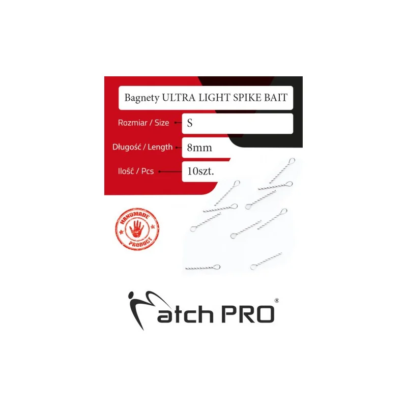 Bagnety ULTRA LIGHT SPIKE BAIT do montażu przynęt typu kulka, dumbells na przyponie. Głównym walorem naszych bagnetów jest praktycznie zerowy ciężar własny co pozytywnie wpływa na pracę przynęt - nie zaburza ich własnych właściwości. Kolejną zaletą jest to, że mają bardzo małą średnicę przez co możemy je stosować nawet do przynęt o średnicy 5mm bez obawy, że przynęta nam się rozpołowi.