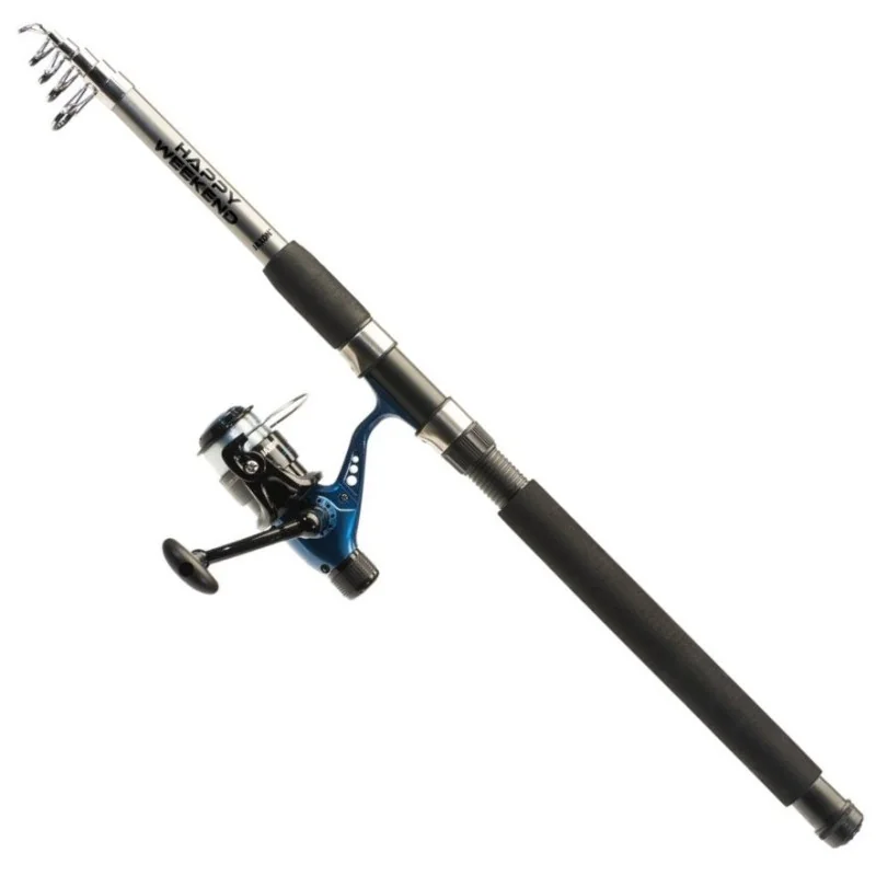 Zestaw wędkarski Happy Weekend to wszechstronny w pełni wyposażony pakiet do łowienia składający się z wędki teleskopowej, kołowrotka i żyłki 0,22 mm. Doskonała dla wędkarzy początkujących lub na rodzinne zasiadki.