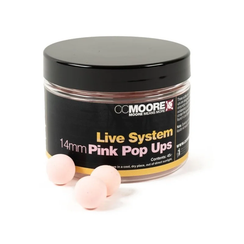 Kulki Live System Pink Pop Ups to przynęty pływające w kolorze różowym o średnicy 14 mm. Zawierają potężną, migdałowo-kremową mieszankę smakową Live System, dzięki czemu idealnie nadają się do stosowania samodzielnie lub z produktami gamy kulek Live System. Dostarczane w pojemnikach po 45 sztuk.