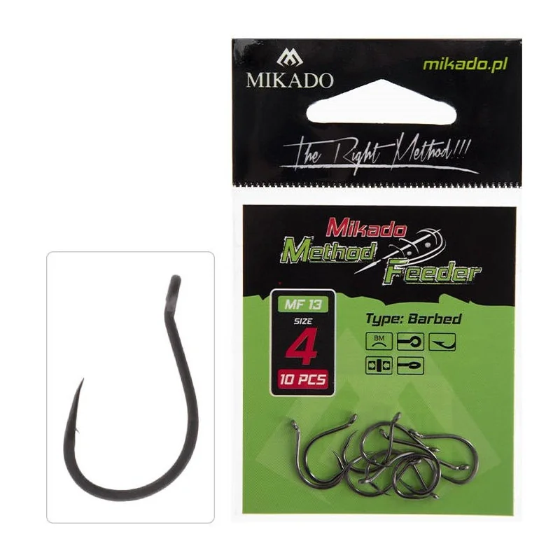 Haczyk specjalnie zaprojektowany do Method Feeder, charakteryzujący się niesamowitą chwytliwością, wytrzymałością i dzięki specyficznemu kształtowi - perfekcyjnym trzymaniem zaciętej ryby. Wykończony czarnym, matowym kolorem i mikrozadziorem.