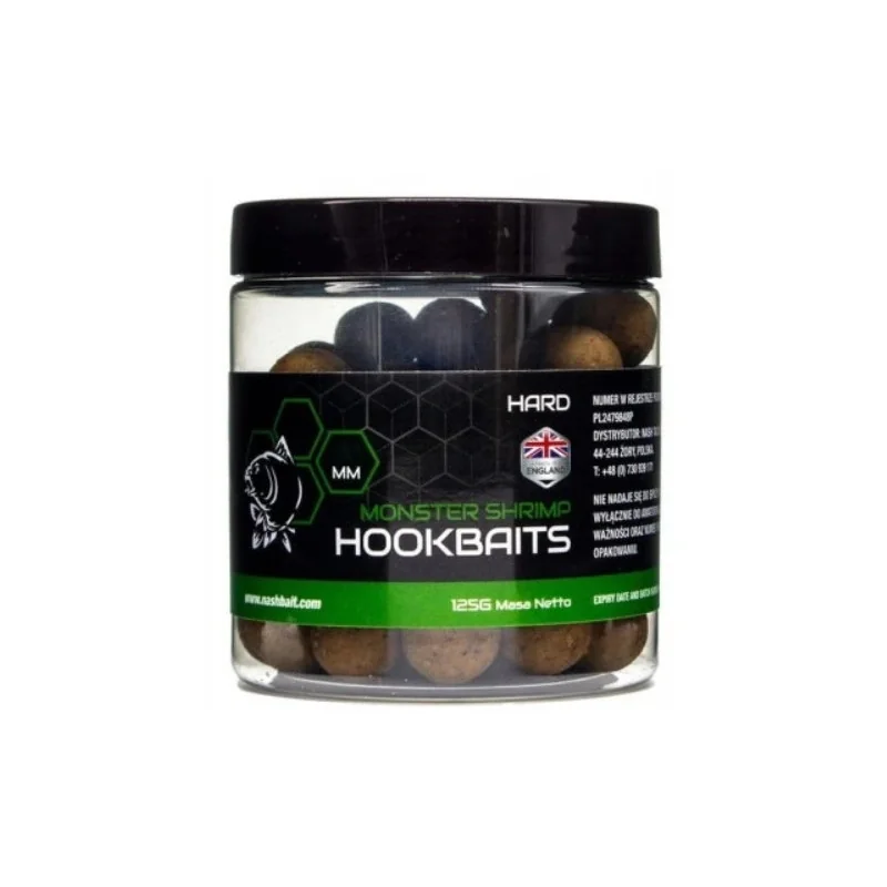 Przynęta Monster Shrimp Hard Hookbaits to utwardzone kulki Monster Shrimp to podstawowa broń na wodach pełnych drobnicy i raków. Dzięki odpowiedniej konsystencji, przypony uzbrojone w te przynęty można pozostawić w wodzie na bardzo długi czas.