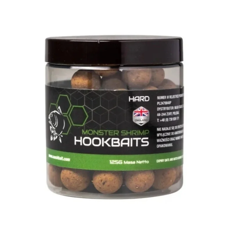 Przynęta Monster Shrimp Hard Hookbaits to utwardzone kulki Monster Shrimp to podstawowa broń na wodach pełnych drobnicy i raków. Dzięki odpowiedniej konsystencji, przypony uzbrojone w te przynęty można pozostawić w wodzie na bardzo długi czas.
