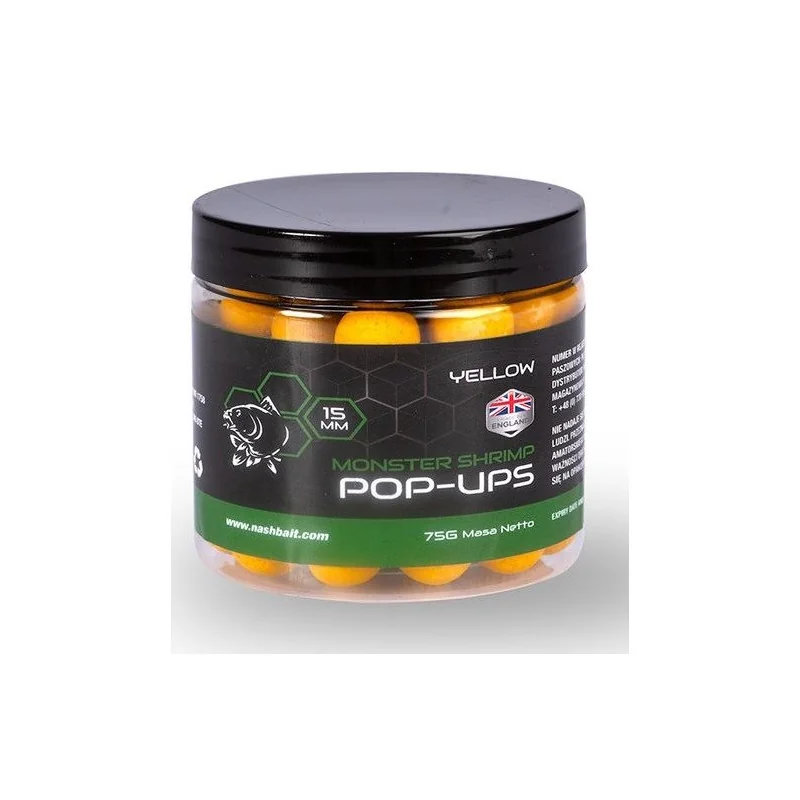 Kulki Monster Shrimp Pop Ups Yellow to wyjątkowo wyporne, przyjazne dla igieł pop-upy z podwyższoną zawartością oleju krabowego, oleju z homara i pasty z Nashbait Salted Shrimp Paste. Zaprojektowane, aby zapewnić skuteczną prezentację przyponów Ronnie, Chod i Stiff Rig przez 24–48 godzin.