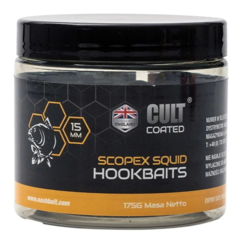Przynęty Scopex Squid Cult Coated Hookbait to żywe kultury bakterii unikalne dla Nashbait, nakładane wielokrotnie warstwami, nasycone zabójczo skutecznymi atraktorami Scopex Squid i tworzące otoczkę kulki, rozpuszczają się, zapewniając przynęcie maksymalną atrakcyjność.