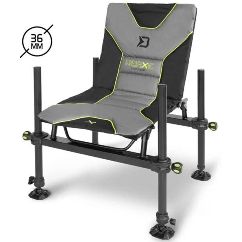 Na górze przednich nóg znajdują się uniwersalne gwinty do mocowania różnych uchwytów feederowych lub innych akcesoriów. Siedzisko składa się z miękkiego materaca zapewniającego wygodę przez cały dzień. Krzesło jest szare i czarne z odważnymi zielonymi elementami w stylu REAXE.