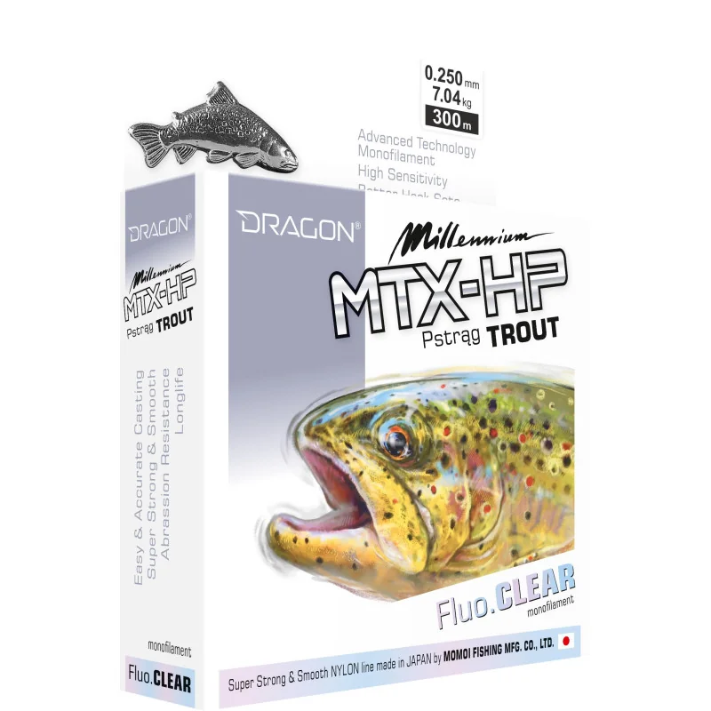 Żyłki powstające w Japonii, z surowców polimerowych najwyższej jakości, ściśle według opracowanych przez firmę Momoi procesów technologicznych. Kolejne generacje serii MILLENNIUM przez dziesięciolecia ugruntowały swoją pozycję jako najlepiej dopracowane produkty do połowu wybranych gatunków ryb. Sprzedawane w opakowaniu próżniowym, zabezpieczającym żyłkę w 100% przed procesami starzenia. Dzięki temu można je przechowywać bez utraty jakości przez bardzo długi okres. Millennium MTX-HP PSTRĄG Bardzo mocna i odporna na ścieranie żyłka spinningowa. Specjalnie dobrany, fluoroscencyjny kolor pozwala widzieć ją znakomicie na tle wody, a jednocześnie pozostaje niewidoczny pod wodą.