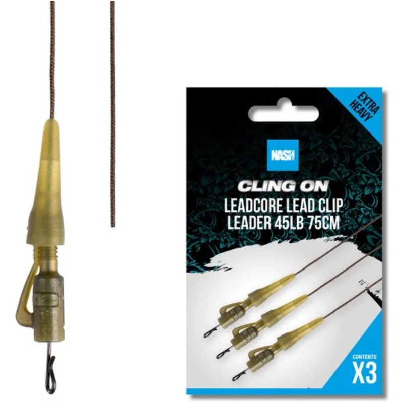 Uniwersalny anty plączący się przypon Lead Clip na odpornym na ścieranie, szybko tonącym przyponie 45lb Cling On Leadcore. Wykończony krętlikiem do szybkiej wymiany w rozmiarze 8 dla łatwej wymiany przyponów z pętlą.