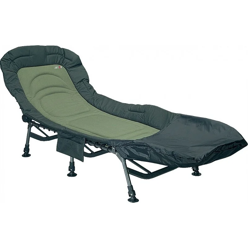 Duże, wygodne łóżko karpiowe wsparte na 3 parach nóg, regulacja kąta nachylenia. Wymiary: 75 x 210 x 35 cm.