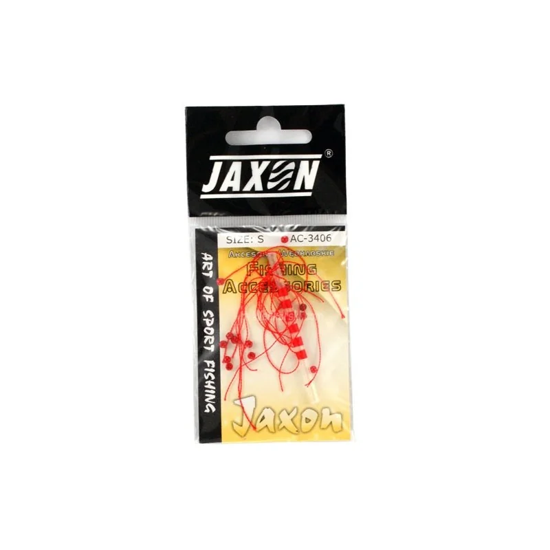 Stopery nitkowe firmy Jaxon. Stopery w kolorze czerwonym bardzo dobrze widoczne nad wodą. Model stopera 3406 przeznaczony jest do najmniejszych średnic żyłek. Model stoper 3408 do najgrubszych żyłek powyżej 0,20mm. Stopery nitkowe mają tę zaletę, że to od nas zależy siła jej zacisku. Po odpowiednim zaciśnięciu odcinamy końcówki i możemy montować zestaw końcowy.