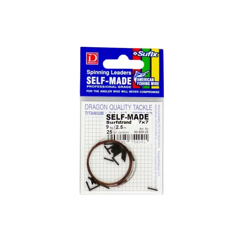 Przypon w kolorze jasnobrązowym, bez powłoki nylonowej. 49 supercienkich włókienek splecionych ze sobą tworzy miękką linkę, która nie wpływa zupełnie na pracę prowadzonej przynęty. 2,5 m linki i 25 sztuk zacisków.