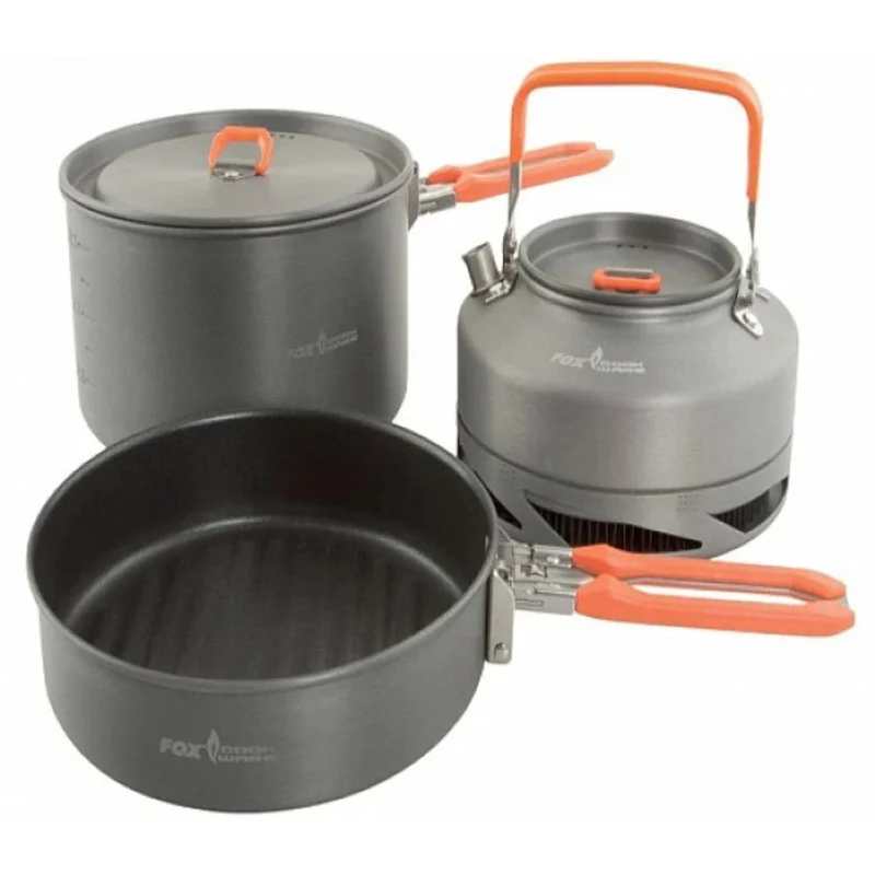 3-częściowy zestaw naczyń kuchennych składający się z patelni, średniego garnka oraz czajnika o pojemności 0.9l. Pogrubiono aluminiowe ścianki garnka oraz patelni, aby można było powlec naczynia warstwą wysokiej jakości materiału, dzięki któremu potrawy nie będą przywierać do dna. Jak wiemy wiele firm wędkarskich ma obecnie w ofercie naczynia, które reklamowane są jako nieprzywierające.