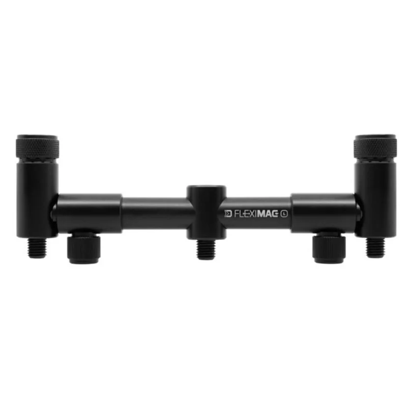 Ramiona są ścięte płasko na dole, więc po dokręceniu śruby blokującej trzymają się na miejscu i nie obracają się. FlexiMAG BUZZ jest wykonany z wytrzymałego aluminium z czarną trwałą powłoką. Jest dostępny w dwóch rozmiarach: L (krótszy) na dwie wędki i XL (dłuższy) na trzy wędki.
