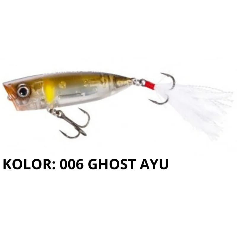 Shimano Bantam World Pop 69F to klasyczny popper średnich rozmiarów, wyposażony w opatentowane technologie Shimano: FLASH BOOST oraz SCALE BOOST, które dodatkowo oddziaływają na zmysły drapieżników, prowokując je do brania. Dzięki technologii FLASH BOOST, wykorzystującej system podwieszonego lusterka, połączony z częściowo transparentnym korpusem, Bantam World Pop oddziałuje nie tylko na linię boczną ryby, ale również na jej dobrze wyostrzony zmysł wzroku. Z każdym podciągnięciem, wobler rozświetla powierzchnię wody, prowokując drapieżniki do ataku. Nawet podczas pauzy w prowadzeniu, pulsacyjne światło rozchodzi się po powierzchni, aktywując ryby ustawione kilka metrów poniżej. Łowienie na poppery to świetna zabawa, a widok mocno sprowokowanego drapieżnika chwytającego naszą przynętę niejednokrotnie potrafi podnieść ciśnienie. Ponadto, łowienie na poppery to często jedyne słuszne rozwiązanie na mocno zarośniętych łowiskach, gdzie klasycznych woblerów i miękkich przynęt po prostu nie zdołamy poprowadzić. Jako lider w tym segmencie przynęt, Shimano Bantam World Pop cechuje się powtarzalną pracą i głośnym, niskim, charakterystyczym dźwiękiem imitującym żerującego przy powierzchni okonia. To zdecydowany numer 1 na letnie łowienie okoni oraz boleni.