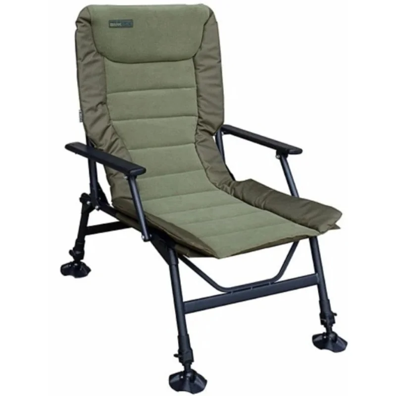 Bank-Tek Armchair charakteryzuje się średniej wysokości oparciem z poduszką polarową, która zapewnia dodatkowy komfort i wsparcie. Wygodne podłokietniki i regulowany system nóg z obrotowymi stopami sprawiają, że jest to idealne krzesło dla każdego wędkarza. Dodatkowo, system zabezpieczający na przednich i tylnych nogach zapewnia stabilność i bezpieczeństwo, niezależnie od rodzaju podłoża.