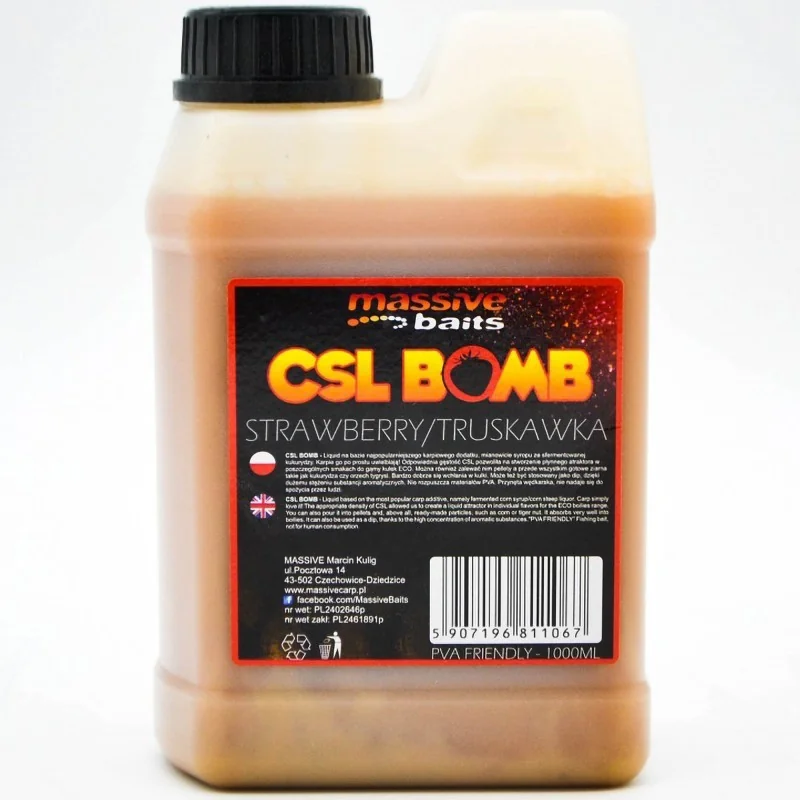 Nasz CSL BOMB to liquid na bazie najpopularniejszego karpiowego dodatku, mianowicie syropu ze sfermentowanej kukurydzy. Karpie go po prostu uwielbiają! Odpowiednia gęstość CSL pozwoliła na stworzenie płynnego atraktora w smakach odpowiednich do gamy kulek ECO. Można również zalewać nim pellety a przede wszystkim gotowe ziarna takie jak kukurydza czy orzech tygrysi. Bardzo dobrze się wchłania w kulki. Może też być stosowany jako dip, dzięki dużemu stężeniu substancji aromatycznych.