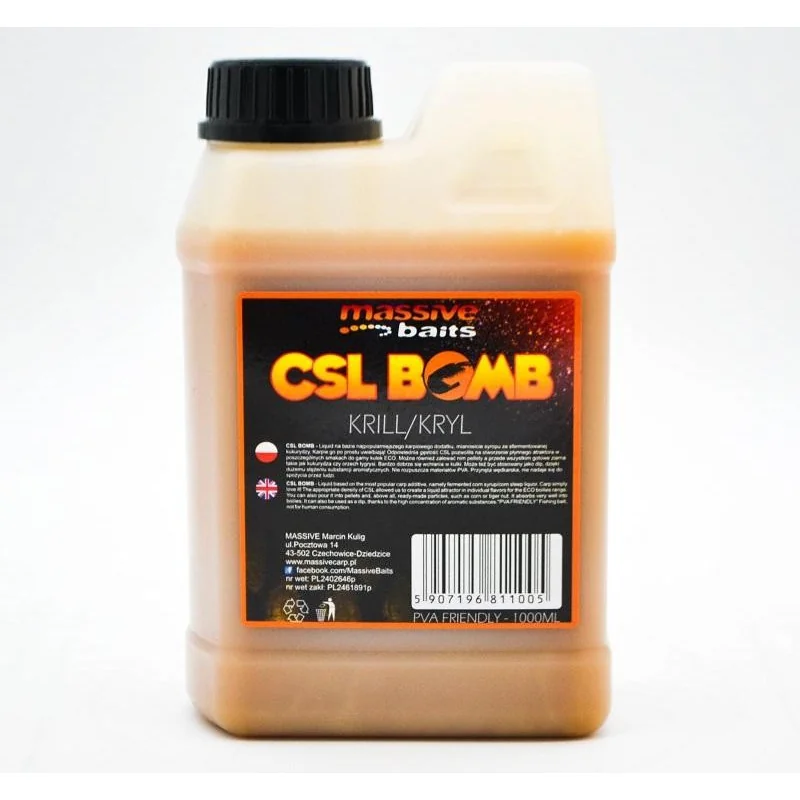 Nasz CSL BOMB to liquid na bazie najpopularniejszego karpiowego dodatku, mianowicie syropu ze sfermentowanej kukurydzy. Karpie go po prostu uwielbiają! Odpowiednia gęstość CSL pozwoliła na stworzenie płynnego atraktora w smakach odpowiednich do gamy kulek ECO. Można również zalewać nim pellety a przede wszystkim gotowe ziarna takie jak kukurydza czy orzech tygrysi. Bardzo dobrze się wchłania w kulki. Może też być stosowany jako dip, dzięki dużemu stężeniu substancji aromatycznych.