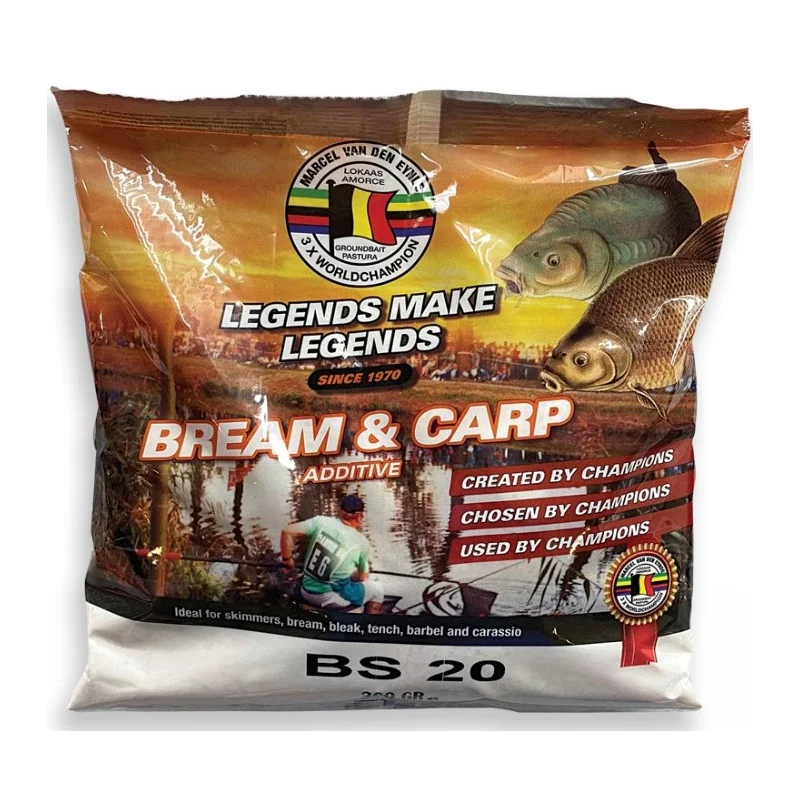 W Van Den Eynde opracowaliśmy specjalny stymulator apetytu (dodatek), BS20. Nazwa nawiązuje do najczęściej łowionych ryb, którymi są: Leszcz i Skimmer. Podczas testów produkt ten udowodnił, że jest wszechstronnym produktem odpowiednim dla każdego rodzaju łowiska (podajnik, metoda i tyczka).