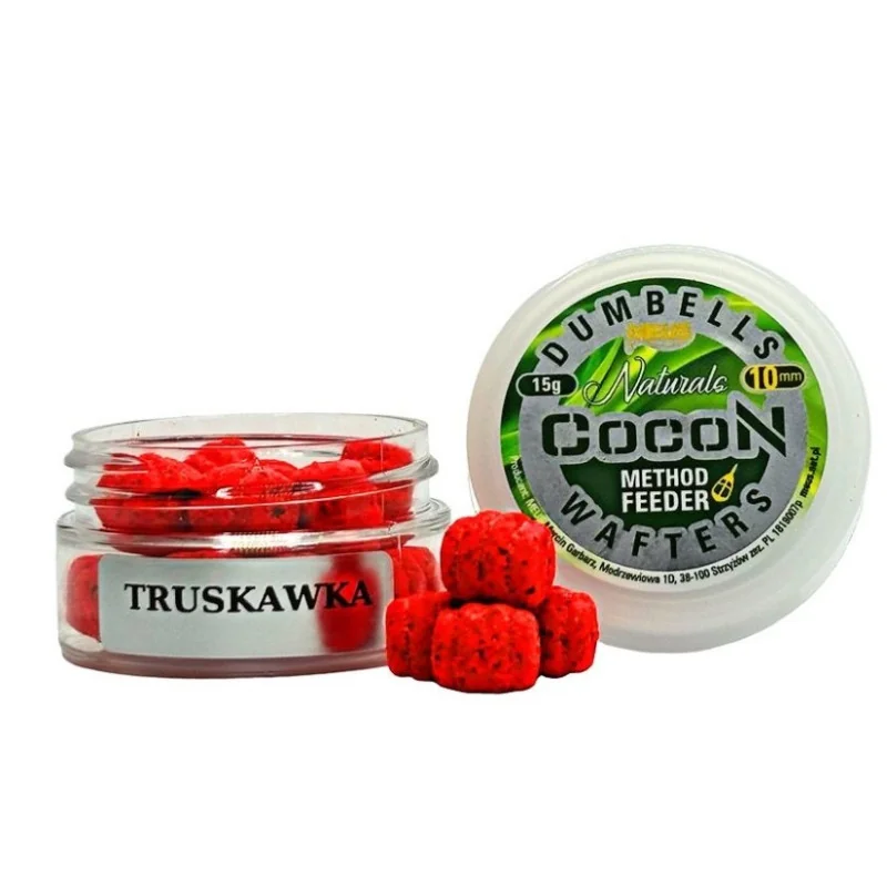 Waftersy MEUS Dumbells Cocon Wafters - Przynęty zbalansowane typu wafters cieszą się bardzo dużą popularnością w method feederze. Jest to związane z tym, że poddają się one ruchom wody, dzięki czemu zachowują się bardziej naturalny sposób, nie wzbudzając podejrzeń wśród bardziej płochliwych ryb. Równocześnie znajdują się na szczycie obsypującego się koszyka spełniając rolę "wisienki na torcie". Dostępne w wielu atrakcyjnych aromatach oraz dwóch rozmiarach: 8mm oraz 10mm.