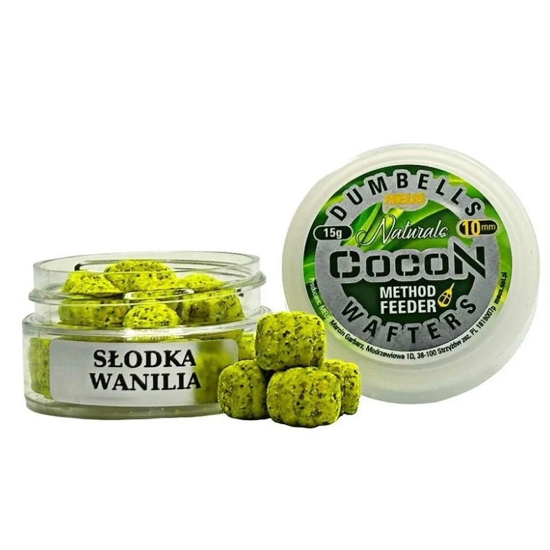 Waftersy MEUS Dumbells Cocon Wafters - Przynęty zbalansowane typu wafters cieszą się bardzo dużą popularnością w method feederze. Jest to związane z tym, że poddają się one ruchom wody, dzięki czemu zachowują się bardziej naturalny sposób, nie wzbudzając podejrzeń wśród bardziej płochliwych ryb. Równocześnie znajdują się na szczycie obsypującego się koszyka spełniając rolę "wisienki na torcie". Dostępne w wielu atrakcyjnych aromatach oraz dwóch rozmiarach: 8mm oraz 10mm.