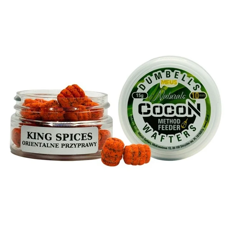 Waftersy MEUS Dumbells Cocon Wafters - Przynęty zbalansowane typu wafters cieszą się bardzo dużą popularnością w method feederze. Jest to związane z tym, że poddają się one ruchom wody, dzięki czemu zachowują się bardziej naturalny sposób, nie wzbudzając podejrzeń wśród bardziej płochliwych ryb. Równocześnie znajdują się na szczycie obsypującego się koszyka spełniając rolę "wisienki na torcie". Dostępne w wielu atrakcyjnych aromatach oraz dwóch rozmiarach: 8mm oraz 10mm.