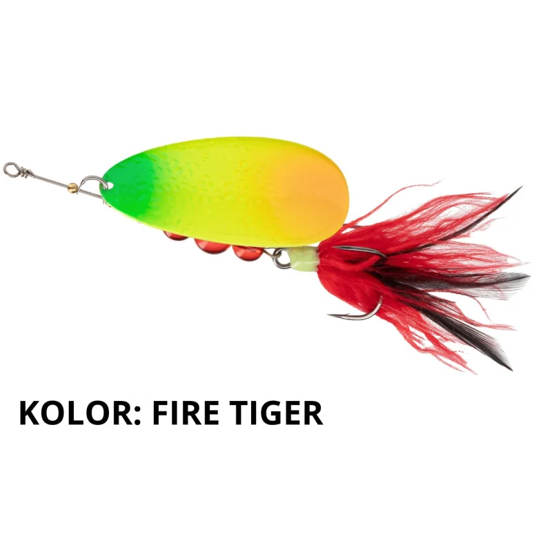 Duża oraz lekka błystka obrotowa, która idealnie sprawdza się na płytkich i zarośniętych zbiornikach przy połowie szczupaków oraz rekordowych okonii. Unikalne malowanie paletki w połączeniu z chwostem, dodatkowo prowokuje ospałe drapieżniki do brania.