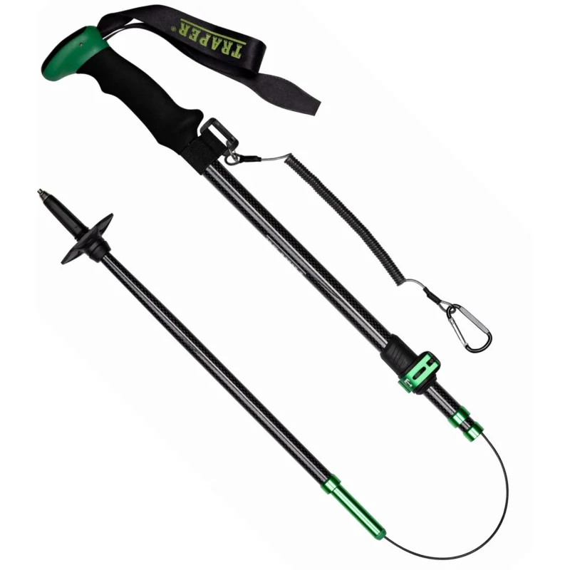 Konstrukcja tego kija oparta jest na wysokiej klasy, lotniczym aluminium. Dzięki temu stopowi uzyskano optymalną wagę 286 gramów. Wytrzymała rączka z pianki EVA, zakończona pętlą, gwarantuje pewny chwyt. Na dole umieszczono antypoślizgowy, widiowy bolec, dodatkowo znajdziemy gumową nakładkę oraz talerzyk z tworzywa. Elementy kijka połączone są mocną powlekaną linką. Rozkładanie odbywa się poprzez rozciągnięcie do momentu automatycznego zablokowania. Na górnej części znajdziemy podziałkę w centymetrach i calach. Umożliwia to szybkie dopasowanie długości do wzrostu. W komplecie znajdziemy nakładkę gumową , talerzyk z mocnego tworzywa oraz neoprenowy pokrowiec. Doczepiana linka z karabińczykiem zapobiega zgubieniu kija.