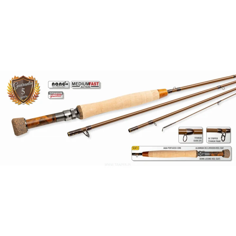Wędzisko zaprojektowane i wykonane z myślą o wędkarzach łowiących techniką nimfową. Charakterystycznym elementem wędek 10'6" jest odwrócony uchwyt kołowrotka, dzięki tej modyfikacji środek ciężkości wędki przesuwa się maksymalnie do tyłu, dając idealny balans. Wędki 10'0" mają uchwyt klasyczny. Solidne elementy rękojeści, przelotki oraz blank o niezwykłej dynamice, to główne cechu i zalety tej nowoczesnej "nimfówki". Do konstrukcji wędki użyto japońskiego blanku 40+46T. Tytanowe ultralekkie przelotki na pojedynczych stopkach nie przeciążają wędki, która jest lekka i doskonale wyważona. Egzotyczne drewno i solidny aluminiowy uchwyt do kołowrotka, wykończony wytrzymałą mieszanką korka i gumy dodają smaku i charakteru temu wędzisku. Wyselekcjonowany portugalski korek klasy AAAA zastał zakończony egzotycznym drewnem. W ofercie znalazły się wędki w jednej, optymalnej długości, natomiast dostępne klasy umożliwiają łowienie różnej wielkości ryb w wodach o różnej charakterystyce od płytkich, spokojnych rzek, do głębokich i rwących potoków. W komplecie tuba z cordury, która posiada oddzielne komory na składy wędki. Wędzisko objęte jest 5-letnią gwarancją serwisową.