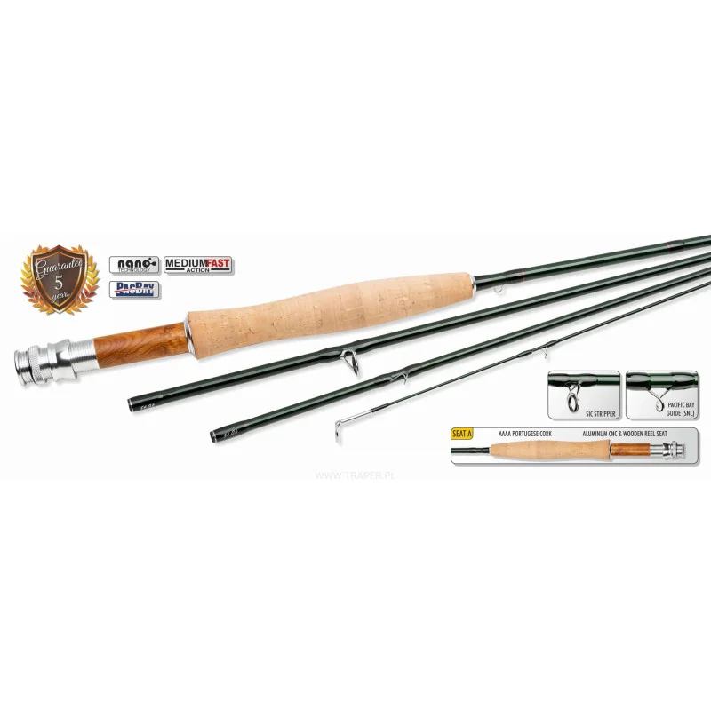 Wędka dedykowana dla specjalistów od łowienia na suchą muchę. Bardzo wytrzymały, o wysokich parametrach technicznych, japoński blank 40-46T, lekkie przelotki Pacyfic Bay Slim tworzą optymalne rozwiązanie dla tej techniki wędkowania. Ultralekki, wykonany z lotniczego aluminium uchwyt do kołowrotka, połączony z egzotycznym drewnem, doskonale uzupełnia całość. Niezwykle harmonijna i równomierna akcja przy ugięciu. Bardzo precyzyjne i dalekie rzuty, wykonuje się z łatwością i bez wysiłku. Do transportu służy tuba z Cordury z podziałem na sekcje wędziska. Wędka posiada 5 letnią gwarancję serwisową.