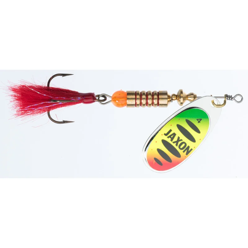 Obrotówka Jaxon HS Kabos - obrotówki z klasycznym korpusem i wbudowanym koralikiem w jaskrawym kolorze. Chwost-wabik z włosia na kotwiczce. W kolorze K chwost w kolorze żółtym, w pozostałych kolorach chwosty czerwone. Praca skrzydełek startuje od pierwszego przekręcenia korbki kołowrotka.